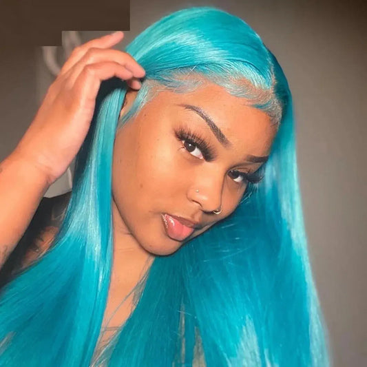 13x4 Lace Wigs Natural Sky Blue Color 10-30" Long Silky Straight Hair 180% Density Preplucked