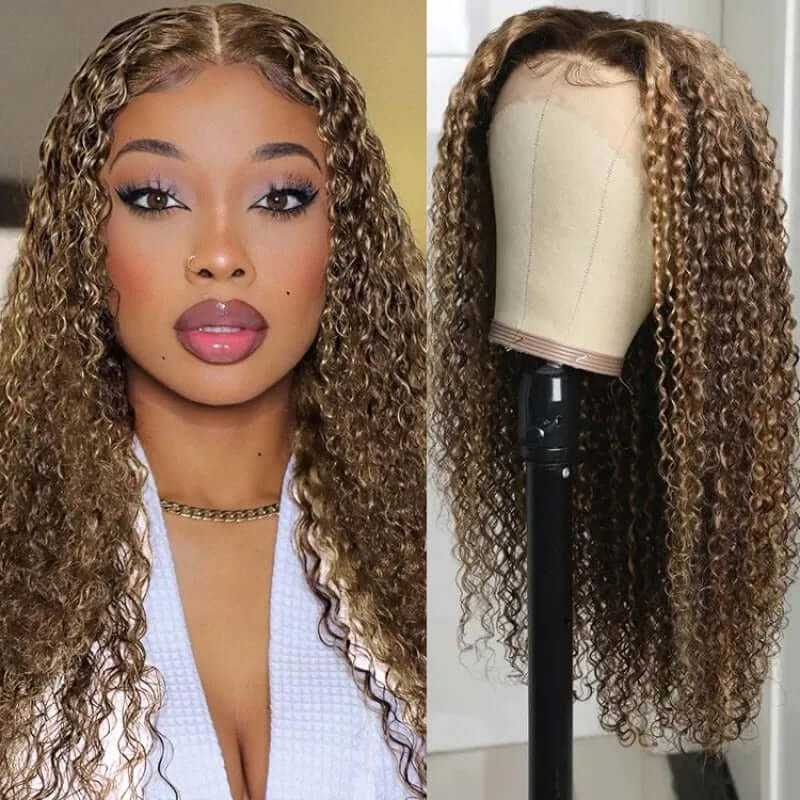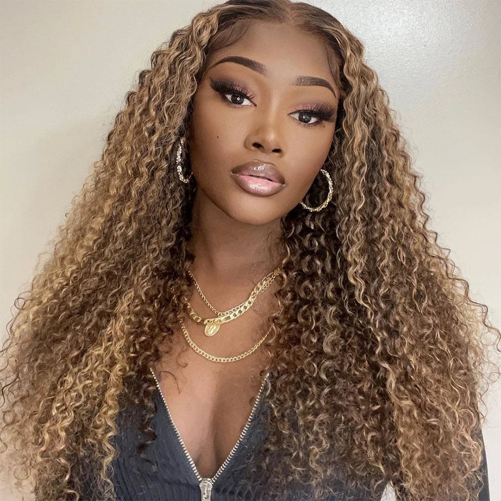 13x4 Frontal / 4x4 Lace Closure Wig Honey Blond Highlight Piano Color P4/27 kinky Curly Lace Wig