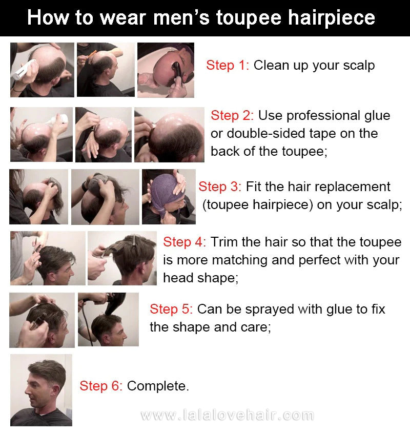 3/ Fit the hair replacement (toupee hairpiece) on your scalp;