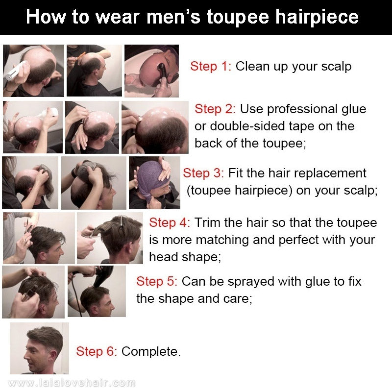 3/ Fit the hair replacement (toupee hairpiece) on your scalp;